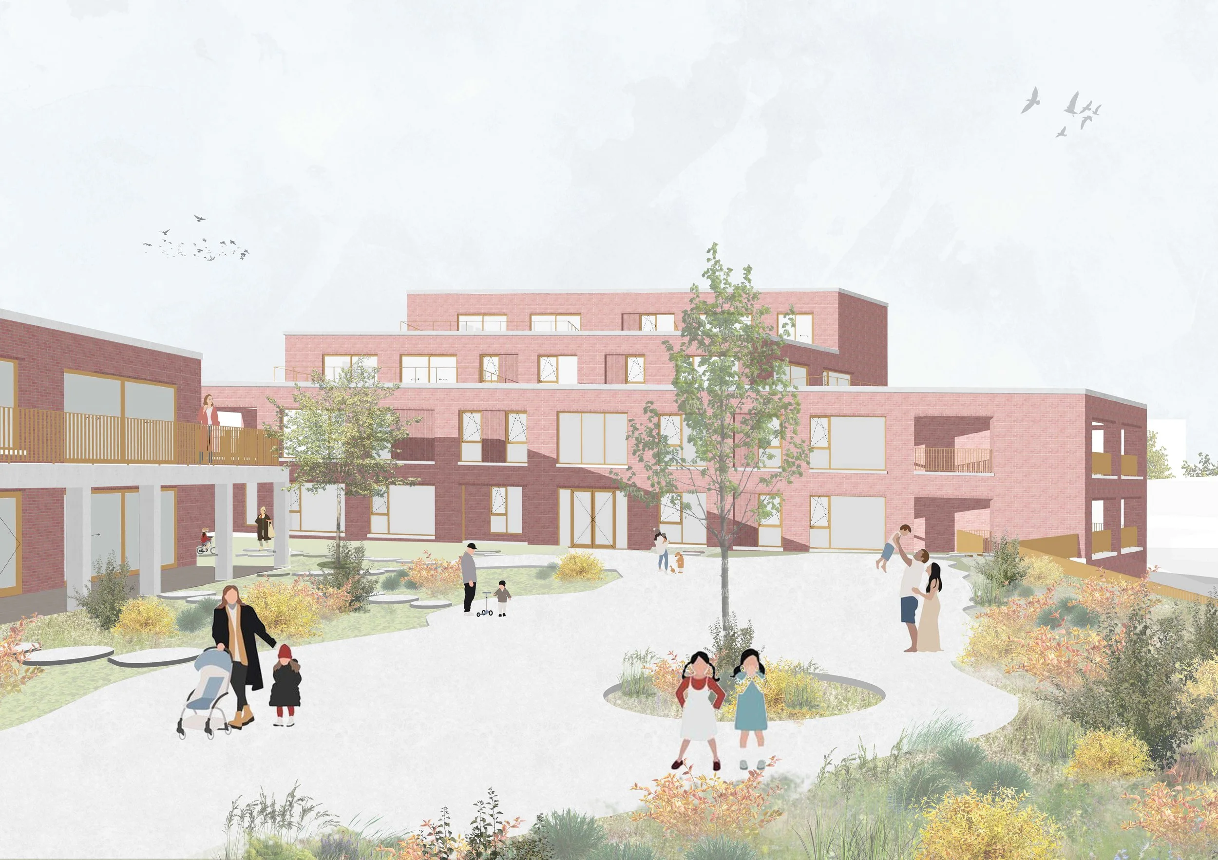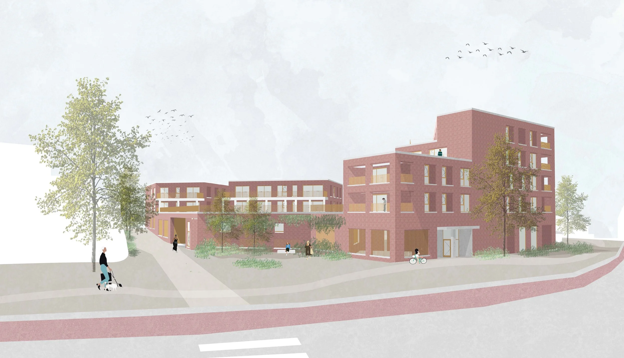 Bovenop de handelsplint verrijzen drie woonvolumes, gegroepeerd rond een collectieve daktuin. Samen vormen ze een harmonieus geheel waarin wonen en retail elkaar versterken. De uitgesproken volumewerking en het uniforme, zachtrode gevelmetselwerk geven het project niet alleen een markante uitstraling, maar ook de rol van oriëntatiepunt in de ruimte. Door de zorgvuldige detaillering en ritmische opbouw wordt het geheel verfijnd en krijgt het een menselijk en toegankelijk karakter.